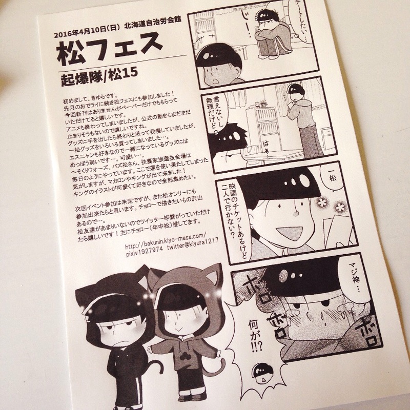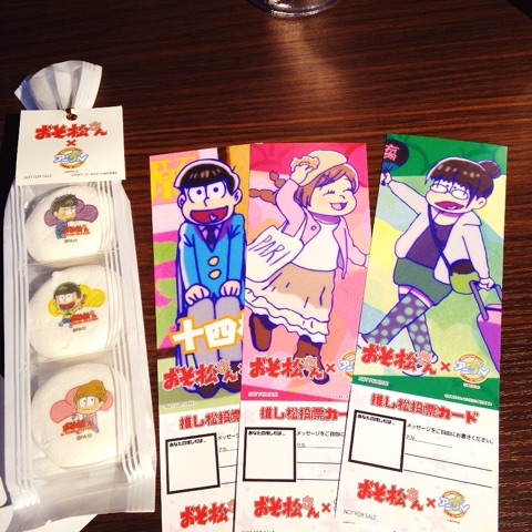 ヲタ繋がりじゃない人と出掛けるの何年ぶりだろう…。 でもカフェコラボは一人じゃ行き辛いので助かりましたw 土曜日なのもあって満席近くになっていて、やっぱり松の人気は凄いなと改めて思います。 そういえばアニメ5/5から北海道の地上波で放送されるので楽しみです。 一松とカラ松のドリンク。 事前にHPで見ても何味かまでは書いてませんでしたが、普通に美味しかったです。 ドリンクに煮干が乗っていてどうしようかと思いましたけどww マシュマロとカード。 入場特典で3人のマシュマロがもらえますが、欲しかった弟組で嬉しいです。 一松とカラ松のデザート。 ソーダゼリーかと思えばパインゼリーのカラ松。 トド松のドリンク。 トド松と十四松ランチ。 カラ松パンケーキ。 6つ子たこ焼き。 最終的にもらった特典一覧。 普通のカフェを想像していましたが、放送局みたいにプログラムが組まれてて一人で来るのは少々勇気が入りそうです…。 その後アニメイトへ行ったりスタバへ寄ったりして解散しました。 アニメイトの会計待ちの列が凄まじくて1つ買うだけで疲れましたが…。 久しぶりにアニメイトへ行った気がしますww 偶にはこんな休日も新鮮でした。 通販ページをBOOTHへ繋げました。 一括で通販管理した方が便利かと思いましたがいまいち使い方が良く分かりませんが…;; よろしくお願い致しますー!!! 本日まで拍手押してくださった方々ありがとうございました!! 2016.04.10 Sun 16:16:58 松フェスに参加してきました!今日は自治労会館で開催されていました松オンリーイベント 「松フェス」にサークル参加してきました。 人は多いだろうと思っていましたが予想以上の混雑ぶりでした。 朝も建物の外に沿って一般、サークルが並んでいて全然列が動きませんでした…。 なんとかサークル入場時間内には入れましたけど。 一般入場が開始してからは、入場制限がかかりそれでも人であふれかえっていました。 お隣は空きスペースでした(最近無双スペースで参加しても多い…) 聞くところによると1階下で開催されていたとうフェスはまったりしていた模様。 年中松本ありがたい事に完売しました! またグッズもいくつかなくなりまして本当にありがとうございます! 次回の松フェスも参加したかったのですが、前日三十六計なので有給が取れればそっちに参加する予定です。 5月つどーむは悩み中…。松オンリー併設してるので参加したいですが、何せ置くものが少ない…。 明日サークル締切なので今日中は悩みます。 先日から整理していたブログのサイト移動がやっと終わりました。 エムぺとナノを数年使っていたので。昔の日記はリンクを繋げていたのですが、 いっそ統合してサイトは消そうかと。 毎日書いていたのでコピペの量がかなりありましたが…;; ついてに見返していると、客観的に見てどういう生活してたんだろうと言うくらい 毎日漫画は更新してるし、衣装は数日単位で完成してるし、 数か月に1回イベント主催してるし、毎週イベント行っていたみたいです。 別に忙しいとか感じませんでしたが凄く生き急いでいましたねww 今はもうそんな体力ないんですが;; それでも日記くらいは更新出来たらと思います。 本日まで拍手押してくださった方々ありがとうございました!! |