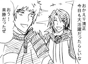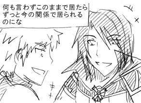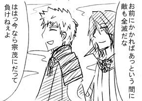 PAGE | 93 94 95 96 97 98 99 100 101 102 103 | ADMIN | WRITE 2013.05.21 Tue 19:49:56 描いた夢と優しい君 いつも明日が僕らを待っている1(宗茂×元就)明日に続きます。 久しぶりの宗就。 すっかり放置していたお題の残りを埋めて行こうと思います。 その間に宗清ネタを書き溜めしておく…。 逆転裁判5の体験版をやってみました!! 助手が真宵ちゃんじゃなくなって残念でしたが、わりと心音ちゃんも可愛くて好きでしたvv 4までにないシステムがあったのですが、いまいちよくわからない…。 新システムあるのはいいんですけど推理するのに忙しくて追いつかないんですけど。 本当こういうゲーム苦手です…;; またしても検事サイドにはおかしな人がいますけど、検事らしい検事って亜内検事くらいなんじゃ…。 局長になった御剣はやっぱりかっこいい/// 眼鏡が似合いますねvvまぁ似合わない方がおかしいんですけど。 成歩堂くんもなんとなく凛々しくなった感じに見えるので嬉しいです!! ゲーム発売が楽しみ!! 冥ちゃんは出るかな?? 本日拍手を押してくださった方々ありがとうございました!! PR 2013.05.20 Mon 19:34:08 君を抱きしめたら最後3(宗茂×清正)日にちが空いてしまいましたが、こんばんは。 土日は会社の慰安旅行で登別に行ってきました。 年間行事の中でも本当一番嫌な行事…;; 登別に行くのはなんだか久しぶりでした。 最近時代村にコスにも行ってないからね。 会社の決算が5月なので丁度締めの時。 特に会社で話す人がいるわけでもないので(私の部署は隔離されてるので特に交流がない)とにかく暇でした…。 しかもなんか部屋むわっとしてるし。 ビンゴ大会で景品もらえたのは良かったかな。 二日目もアイヌ博物館に行って見学。 気温が低い性か他の観光客もあまりいなかったので寂しい事になっていましたけど。 まぁ何はともあれ終わったので良かったです!! イベント遠征と違って特に日記に書く様な事もないね…(汗) そして今日は夏のボーナス日。 去年よりも全然多かったので良かったです!! きっと遠征してるうちにすぐ無くなりそうですけどね;; 少しは貯金したい。 本日まで拍手押してくださった方々ありがとうございました!! 2013.05.16 Thu 19:53:53 君を抱きしめたら最後2(宗茂×清正)明日に続きます。 劉備「さて、今回は我々蜀のDLCの事だが、孔明、何かいい案はないだろうか?」 諸葛亮「そうですね、魏呉共にまともな職についているので我々も負けてはいられませんし」 趙雲「真面目に働かないともっと財政難に陥りますよ、殿」 劉備「うむ、水だけで暮らす日々は避けたいものだ」 馬超「劉備殿!俺は働くなら正義を貫き通す仕事に就きたい!!」 趙雲「それがすでに非現実なんですよ」 劉備「いや馬超の言う通りだ」 趙雲「殿…?」 劉備「正義を貫かぬ職など働く意味がない」 馬超「おおっ!流石は劉備殿!!」 趙雲「ちょっと殿!孟起をあおらないでください!!!」 劉備「それで馬超よ、どんな職に就きたいのだ?」 馬超「正義の味方!!」 趙雲「だからっ…諸葛亮殿からも何か言ってください…」 諸葛亮「それいいですね」 趙雲「はぁ!?」 諸葛亮「どうせやるからには他の国と違う事をしましょう」 馬超「おおっ軍師殿もわかってくれるか!」 諸葛亮「正義を貫く職等決まっております」 劉備「と言うと?」 諸葛亮「正義の味方、スーパーヒーロー戦隊です」 趙雲「ちょっ!!何言ってるんですか!!」 劉備「良いアイディアだな!早速ヒーロー戦隊を組むことにしよう!!」 馬超「ここはやはり5人なので、五虎将ではいかがだろうか」 趙雲「私はやるなんて言ってませんよ!」 諸葛亮「諦めなさい趙雲殿」 趙雲「私はまともに働いて…」 劉禅「何やら楽しそうな話をしているのだな」 趙雲「劉禅様!」 劉禅「ぜひ私も混ぜて欲しい、諸葛亮、私に出来る事はないだろうか」 諸葛亮「丁度ぴったりの役がありますよ、ただ「イ―」と言ってればいいのです」 劉禅「それなら私にもできそうだ」 趙雲「騙されちゃ駄目ですよ劉禅様!!それはショッカ―です!!」 馬超「趙雲もなんだかんだで詳しいな」 趙雲「うるさい孟起」 劉禅「もちろん趙雲もやるのだろう?」 趙雲「私は…」 劉禅「趙雲」 趙雲「…はいやらせていただきます」 星彩「まったく父上達は働く事をなんだと思っているのかしら」 関平「まぁまぁ父上達がヒーローショウをやっている間に拙者達で稼げばいい」 関興「流石兄上」 張苞「似合ってんな―関興」 関興「張苞もかっこいいよ」 張苞「へへっ」 …とまぁ考えたらまだまだ話は続くんですが、蜀の事情はこんな感じかと。 本日配信のDLC衣装がおもしろい事になっていましたね。 大人組が遊んでるのに対して若者組は真面目に働いていた。 蜀が貧乏なのは大人組のせいなんじゃ…;; 正義のヒーローぜひコスしましょう!! どれも良くて選べないんですけど…!! 後は凄く好きなのが関興張苞。 普通にかっこいいよ…// 劉禅は本当今回全勢力の中でもぶっとんでますよね。 こういうのもいいねvv 仕事の昼休みに見るほど危険
